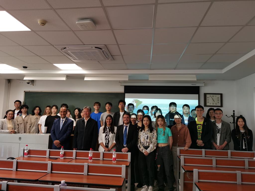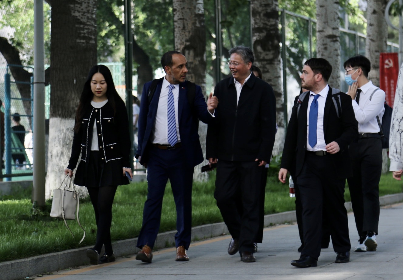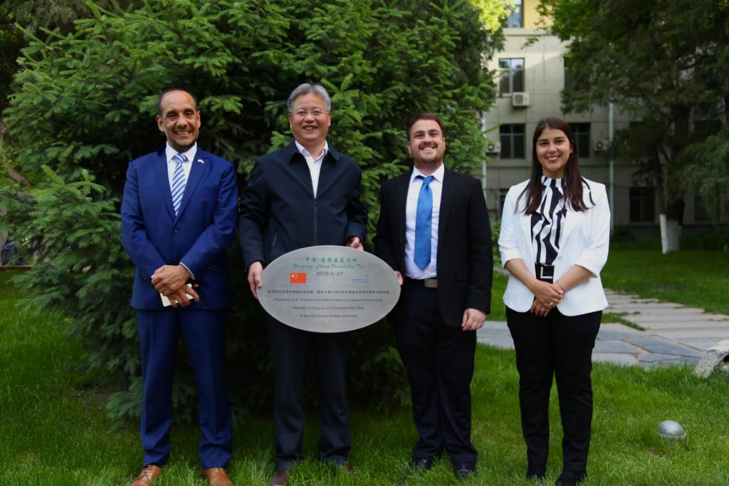 讲座结束后,在太阳成集团tyc234cc经理常福良的陪同下,乌拉圭驻华使馆领事塞尔西奥·德亚巴列、潘慧敏老师、张哲海老师一起参观了北外校园的“中国—乌拉圭友谊树”。