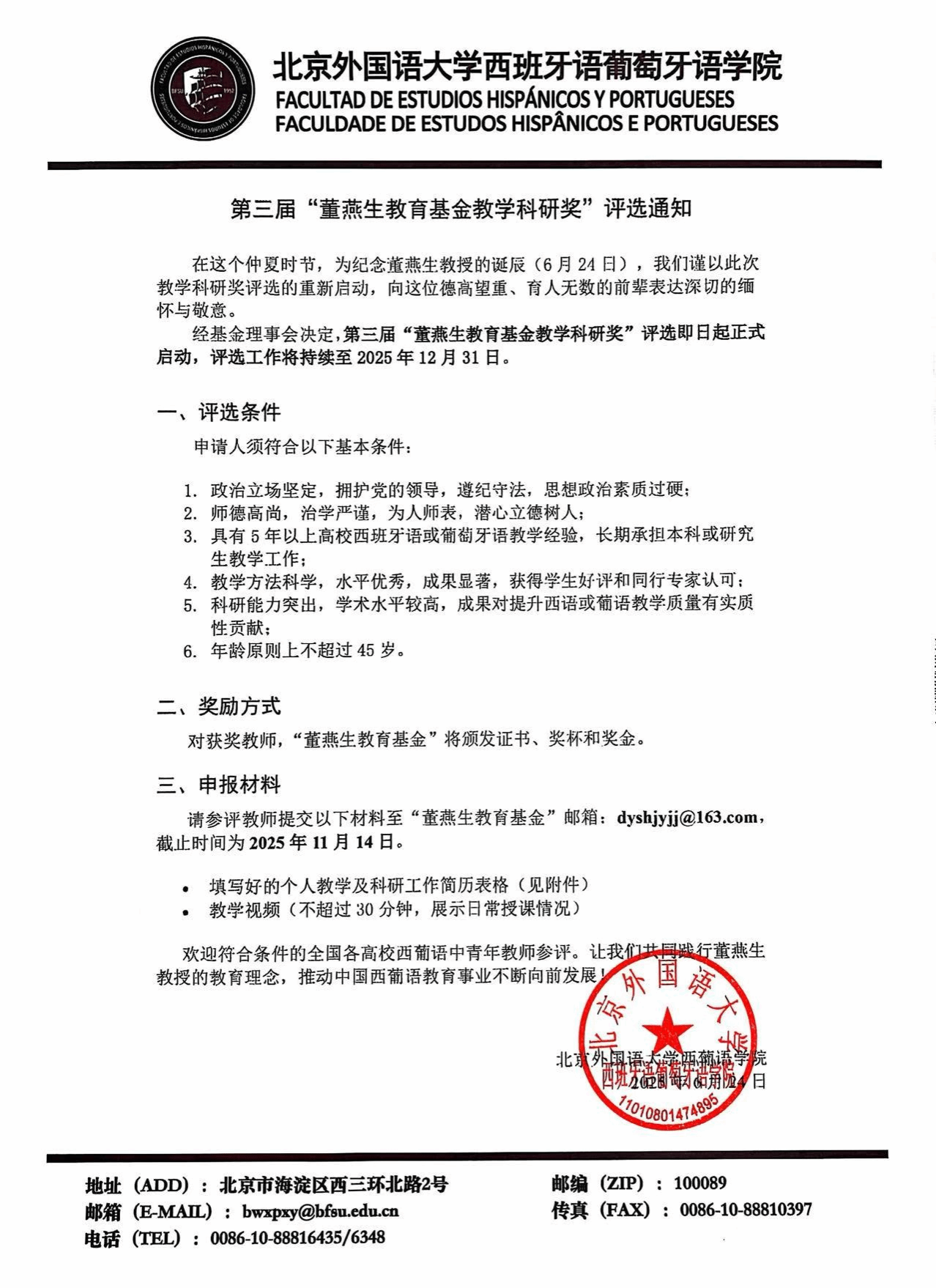 为实现这一宗旨,“董燕生教育基金”设立了“董燕生教育基金教学科研奖”,每两年评选一次,奖励在西葡语教学科研一线表现突出的中青年教师。2017年和2019年,已有徐蕾、李静、曹羽菲、陈星、路燕萍、马丽亚、马征七位教师获得此项殊荣。基金会还组织了多场关于西班牙语专业课程建设与课堂教学的专题研讨活动,受到业内广泛好评。